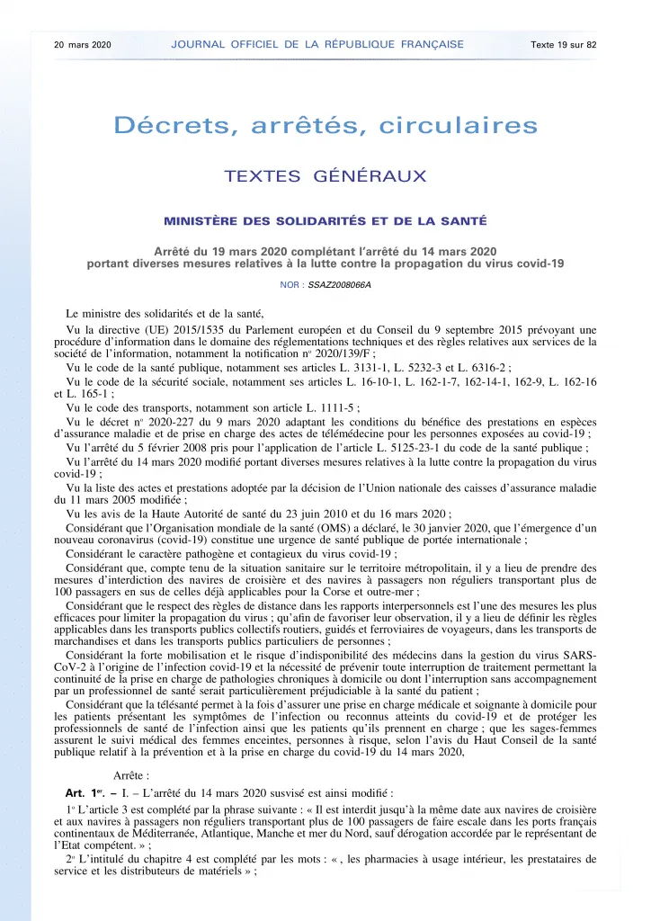 Arrêté JO 20200320 – CORONAVIRUS et TSO