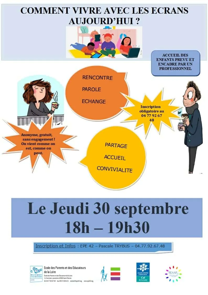 JEUDI 30 SEPTEMBRE de 18h à 19h30 afin de pouvoir échanger en toute liberté et de manière conviviale sur le thème « COMMENT VIVRE AVEC LES ECRANS AUJOURD’HUI ? ».